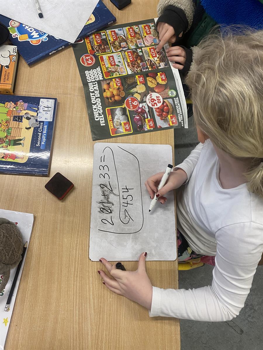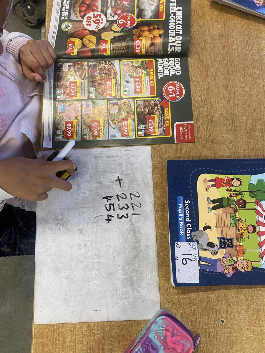 Over the last few weeks the children in 2nd class have been learning about place value. The children have been using their knowledge of place value to complete challenging addition and subtraction sums. They used supermarket leaflets to create number sentences using the weight of products. They enjoyed the challenge of finding the correct combination of products.